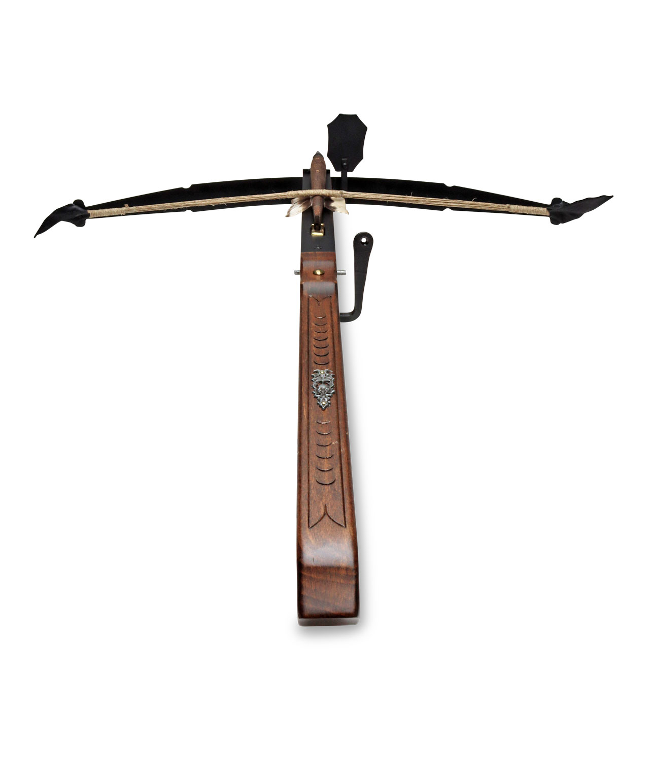 Diese sehr dekorative Armbrust besteht aus Holz und ist mit kräftigen Metallteilen ausgestattet. Die Gesamtlänge der Armbrust beträgt 77cm. Die kunstvollen Schnitzereien ziehen sich über die gesamte Armbrust, die nur zur Dekoration geeignet ist.