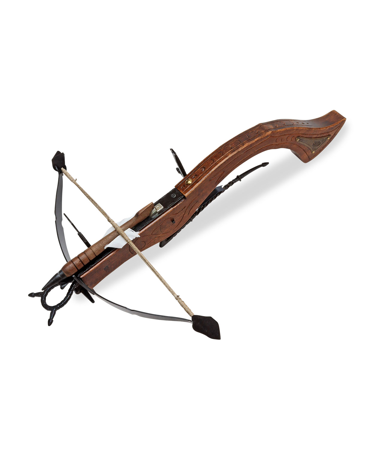Diese sehr dekorative Armbrust besteht aus Holz und ist mit kräftigen Metallteilen ausgestattet. Die Gesamtlänge der Armbrust beträgt 77cm. Die kunstvollen Schnitzereien ziehen sich über die gesamte Armbrust, die nur zur Dekoration geeignet ist.